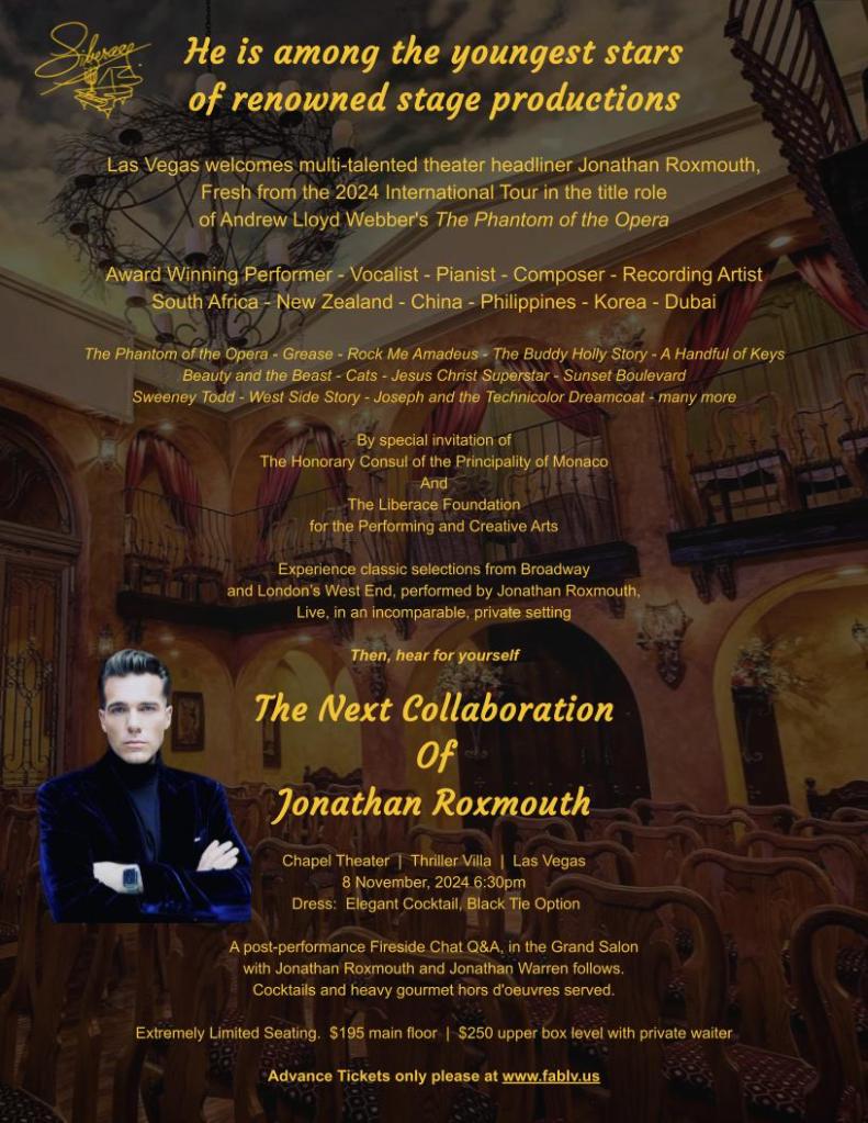 Liberace Foundation welcomes international star of Broadway hits to Thriller Villa’s Chapel Theater jonathanwarren / October 8, 2024 <TICKETS> Share this: Click to share on X (Opens in new window) X Click to share on Facebook (Opens in new window) Facebook Click to share on WhatsApp (Opens in new window) WhatsApp Click to share on LinkedIn (Opens in new window) LinkedIn Click to email a link to a friend (Opens in new window) Email Like Loading...